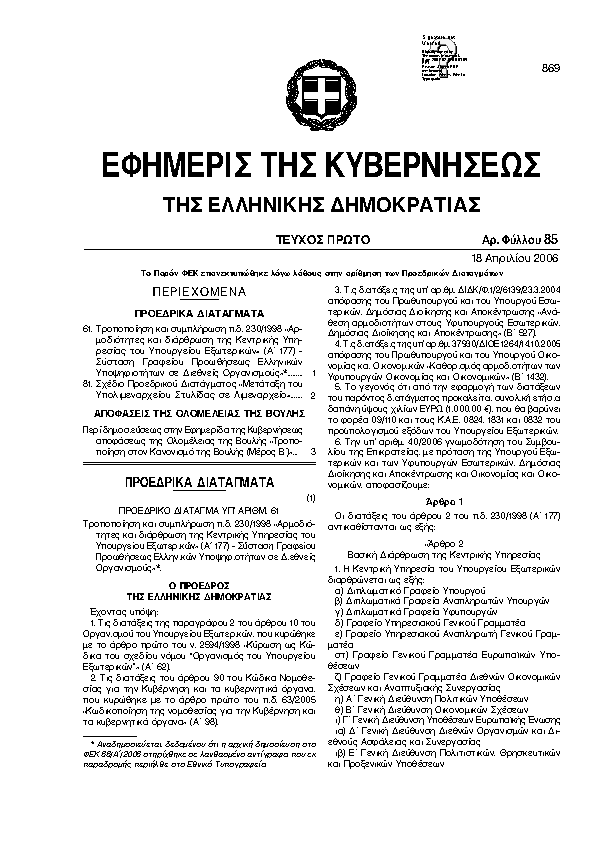 ΤΡΟΠΟΠΟΙΗΣΗ ΚΑΙ ΣΥΜΠΛΗΡΩΣΗ ΠΔ 230/1998 ΑΡΜΟΔΙΟΤΗΤΕΣ ΚΑΙ ΔΙΑΡΘΡΩΣΗ ΤΗΣ ΚΕΝΤΡΙΚΗΣ ΥΠΗΡΕΣΙΑΣ ΤΟΥ ΥΠΟΥΡΓΕΙΟΥ ΕΞΩΤΕΡΙΚΩΝ (Α΄ 177) - ΣΥΣΤΑΣΗ ΓΡΑΦΕΙΟΥ ΠΡΟΩΘΗΣΕΩΣ ΕΛΛΗΝΙΚΩΝ ΥΠΟΨΗΦΙΟΤΗΤΩΝ ΣΕ ΔΙΕΘΝΕΙΣ ΟΡΓΑΝΙΣΜΟΥΣ