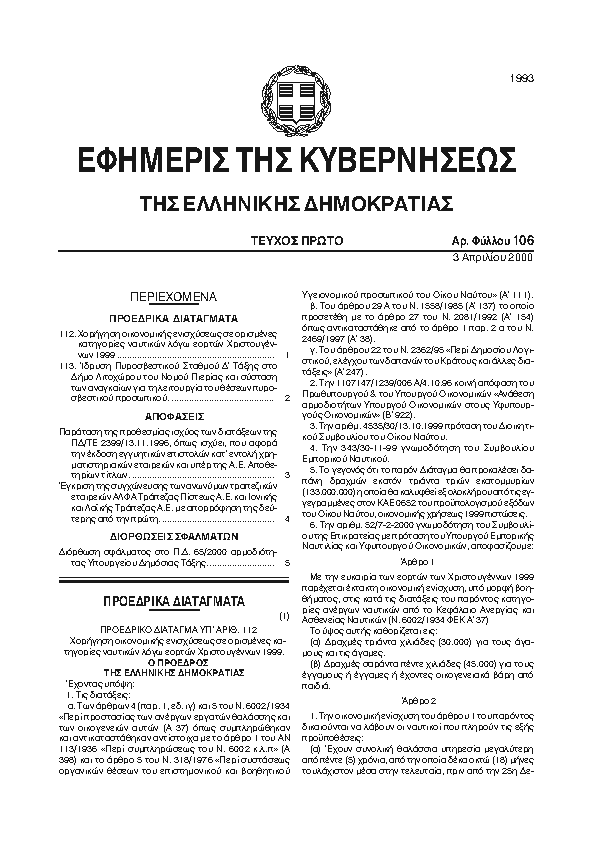 • ΧΟΡΗΓΗΣΗ ΟΙΚΟΝΟΜΙΚΗΣ ΕΝΙΣΧΥΣΗΣ ΣΕ ΟΡΙΣΜΕΝΕΣ ΚΑΤΗΓΟΡΙΕΣ ΝΑΥΤΙΚΩΝ ΛΟΓΩ ΕΟΡΤΩΝ ΧΡΙΣΤΟΥΓΕΝΝΩΝ 1999