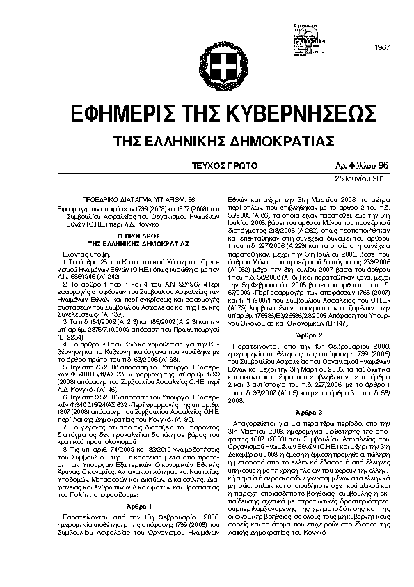 • ΕΦΑΡΜΟΓΗ ΤΩΝ ΑΠΟΦΑΣΕΩΝ 1799 (2008) ΚΑΙ 1807 (2008) ΤΟΥ ΣΥΜΒΟΥΛΙΟΥ ΑΣΦΑΛΕΙΑΣ ΤΟΥ ΟΡΓΑΝΙΣΜΟΥ ΗΝΩΜΕΝΩΝ ΕΘΝΩΝ (Ο.Η.Ε.). ΠΕΡΙ Λ.Δ. ΚΟΝΓΚΟ