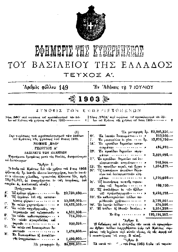 ΠΕΡΙ ΒΕΒΑΙΩΣΕΩΣ ΚΑΙ ΕΙΣΠΡΑΞΕΩΣ ΚΑΙ ΚΑΤΑ ΤΟΝ ΜΗΝΑ ΜΑΪΟΝ ΤΟΥ ΕΤΟΥΣ 1903 ΤΩΝ ΕΣΟΔΩΝ ΤΟΥ ΚΡΑΤΟΥΣ ΚΑΙ ΤΩΝ ΕΣΟΔΩΝ ΤΟΥ ΕΙΔΙΚΟΥ ΤΑΜΕΙΟΥ ΤΩΝ ΦΑΡΩΝ ΚΑΙ ΦΑΝΩΝ ΚΑΙ ΤΟΥ ΤΑΜΕΙΟΥ ΤΟΥ ΕΘΝΙΚΟΥ ΣΤΟΛΟΥ ΤΗΣ ΧΡΗΣΕΩΣ ΤΟΥ ΕΤΟΥΣ 1903 ΚΑΙ ΠΕΡΙ ΧΟΡΗΓΙΑΣ ΠΙΣΤΩΣΕΩΣ ΙΣΗΣ ΠΡΟΣ ΤΟ ΕΝ ΔΩΔΕΚΑΤΗΜΟΡΙΟΝ ΤΩΝ ΠΡΟΫΠΟΛΟΓΙΣΘΕΝΤΩΝ ΕΞΟΔΩΝ ΕΝ ΓΕΝΕΙ ΔΙΑ ΤΗΝ ΧΡΗΣΙΝ ΤΟΥ ΙΔΙΟΥ ΕΤΟΥΣ 1903