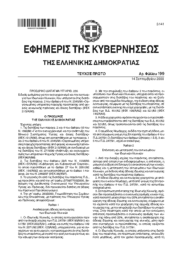 ΕΙΔΙΚΕΣ ΡΥΘΜΙΣΕΙΣ ΓΙΑ ΤΟΝ ΕΚΣΥΓΧΡΟΝΙΣΜΟ ΚΑΙ ΤΗΝ ΛΕΙΤΟΥΡΓΙΑ ΤΩΝ ΙΔΙΩΤ. ΚΛΙΝΙΚΩΝ ΠΟΥ ΥΠΑΓΟΝΤΑΙ ΣΤΙΣ ΔΙΑΤΑΞΕΙΣ ΤΗΣ ΠΑΡ. 2 ΤΟΥ ΑΡ. 8 ΤΟΥ Ν. 2345/95 ΟΡΓΑΝΩΜΕΝΕΣ ΥΠΗΡΕΣΙΕΣ ΠΑΡΟΧΗΣ ΠΡΟΣΤΑΣΙΑΣ ΑΠΟ ΦΟΡΕΙΣ ΚΟΙΝ. ΠΡΟΝΟΙΑΣ ΦΕΚ 213/Α/95).