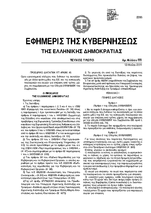 ΟΡΟΙ ΥΓΕΙΟΝΟΜΙΚΟΥ ΕΛΕΓΧΟΥ ΠΟΥ ΔΙΕΠΟΥΝ ΤΙΣ ΣΥΝΑΛΛΑΓΕΣ ΜΕ ΑΛΛΑ ΚΡΑΤΗ ΜΕΛΗ ΤΗΣ Ε.Ε. ΚΑΙ ΤΙΣ ΕΙΣΑΓΩΓΕΣ ΠΟΥΛΕΡΙΚΩΝ ΚΑΙ ΑΥΓΩΝ ΓΙΑ ΕΠΩΑΣΗ ΑΠΟ ΤΡΙΤΕΣ ΧΩΡΕΣ, ΣΕ ΣΥΜΜΟΡΦΩΣΗ ΜΕ ΤΗΝ ΟΔΗΓΙΑ 2009/158/ΕΚ ΤΟΥ ΣΥΜΒΟΥΛΙΟΥ.
