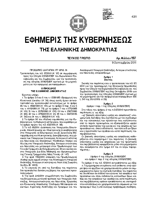 ΤΡΟΠΟΠΟΙΗΣΗ ΤΟΥ Π.Δ. 57/2010 (Α’97) ΣΕ ΣΥΜΜΟΡΦΩΣΗ ΠΡΟΣ ΤΗΝ ΟΔΗΓΙΑ 2009/127/ΕΚ ΤΟΥ ΕΥΡΩΠΑΙΚΟΥ ΚΟΙΝΟΒΟΥΛΙΟΥ ΚΑΙ ΤΟΥ ΣΥΜΒΟΥΛΙΟΥ «ΓΙΑ ΤΗΝ ΤΡΟΠΟΠΟΙΗΣΗ ΤΗΣ ΟΔΗΓΙΑΣ 2006/42/ΕΚ ΣΧΕΤΙΚΑ ΜΕ ΤΑ ΜΗΧΑΝΗΜΑΤΑ ΓΙΑ ΤΗΝ ΕΦΑΡΜΟΓΗ ΦΥΤΟΦΑΡΜΑΚΩΝ».