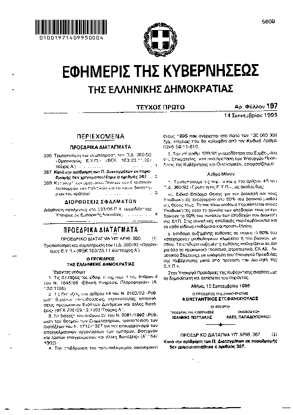 • ΤΡΟΠΟΠΟΙΗΣΗ ΚΑΙ ΣΥΜΠΛΗΡΩΣΗ ΤΟΥ Π.Δ.360/92 ΟΡΓΑΝΙΣΜΟΣ Ε.Υ.Π.
