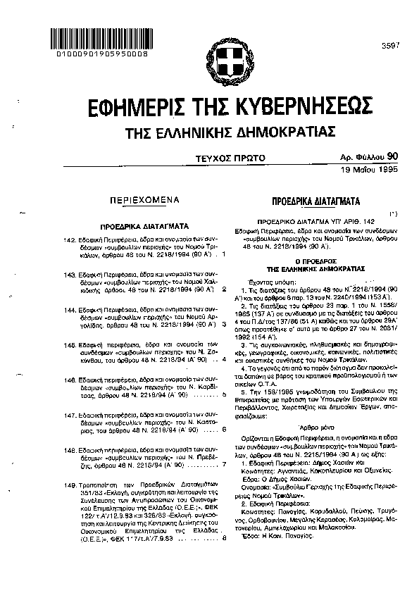 • ΕΔΑΦΙΚΗ ΠΕΡΙΦΕΡΕΙΑ, ΕΔΡΑ ΚΑΙ ΟΝΟΜΑΣΙΑ ΤΩΝ ΣΥΝΔΕΣΜΩΝ ΣΥΜΒΟΥΛΙΩΝ ΠΕΡΙΟΧΗΣ ΤΟΥ ΝΟΜΟΥ ΤΡΙΚΑΛΩΝ, ΑΡΘΡΟΥ 48 Ν.2218/1994 (Α90)