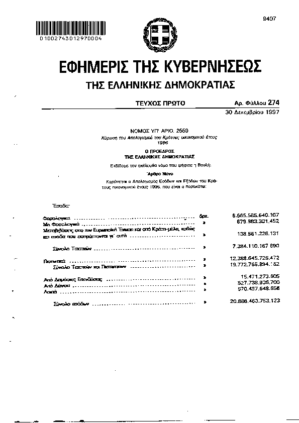 • ΚΥΡΩΣΗ ΑΠΟΛΟΓΙΣΜΟΥΤΟΥ ΚΡΑΤΟΥΣ ΟΙΚΟΝΟΜΙΚΟΥ ΕΤΟΥΣ 1996