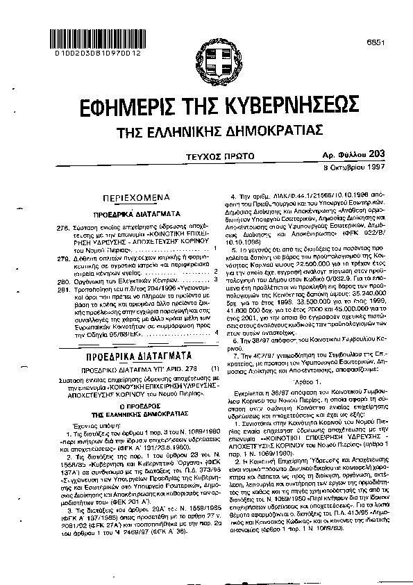 • ΣΥΣΤΑΣΗ ΕΝΙΑΙΑΣ ΕΠΙΧΕΙΡΗΣΗΣ ΥΔΡΕΥΣΗΣ ΑΠΟΧΕΤΕΥΣΗΣ ΜΕ ΤΗΝ ΕΠΩΝΥΜΙΑ ΚΟΙΝΟΤΙΚΗ ΕΠΙΧΕΙΡΗΣΗ ΥΔΡΕΥΣΗΣ ΑΠΟΧΕΤΕΥΣΗΣ ΚΟΡΙΝΟΥ Ν.ΠΙΕΡΙΑΣ