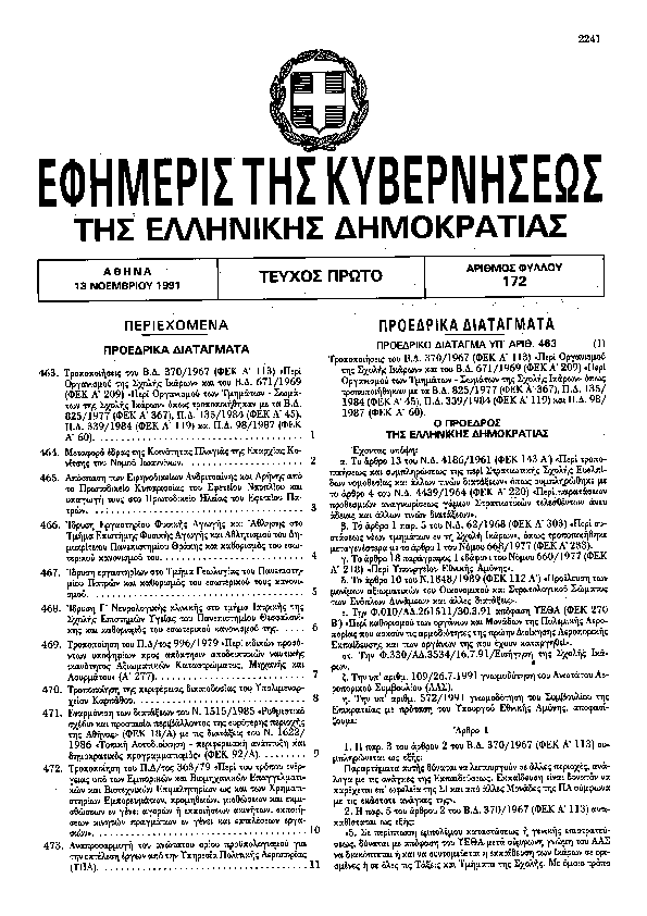 • ΤΡΟΠΟΠΟΙΗΣΕΙΣ ΤΟΥ Β.Δ. 370/1967 (ΦΕΚ Α 113) «ΠΕΡΙ ΟΡΓΑΝΙΣΜΟΥ ΤΗΣ ΣΧΟΛΗΣ ΙΚΑΡΩΝ» ΚΑΙ ΤΟΥ Β.Δ. 671/1969 (ΦΕΚ Α* 209) «ΠΕΡΙ ΟΡΓΑΝΙΣΜΟΥ ΤΩΝ ΤΜΗΜΑΤΩΝ - ΣΩΜΑΤΩΝ ΤΗΣ ΣΧΟΛΗΣ ΙΚΑΡΩΝ» ΟΠΩΣ ΤΡΟΠΟΠΟΙΗΘΗΚΑΝ ΜΕ ΤΑ Β.Δ. 825/1977 (ΦΕΚ Α 367), Π.Δ. 135/1984 (ΦΕΚ Α 45), Π.Δ. 339/1984 (ΦΕΚ Α 119) ΚΑΙ Π.Δ. 98/1987 (ΦΕΚ Α 60).