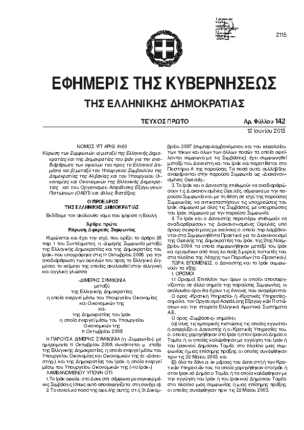 • ΚΥΡΩΣΗ ΤΩΝ ΣΥΜΦΩΝΙΩΝ: Α) ΜΕΤΑΞΥ ΤΗΣ ΕΛΛΗΝΙΚΗΣ ΔΗΜΟΚΡΑΤΙΑΣ ΚΑΙ ΤΗΣ ΔΗΜΟΚΡΑΤΙΑΣ ΤΟΥ ΙΡΑΚ ΓΙΑ ΤΗΝ ΑΝΑΔΙΑΡΘΡΩΣΗ ΤΩΝ ΟΦΕΙΛΩΝ ΤΟΥ ΠΡΟΣ ΤΟ ΕΛΛΗΝΙΚΟ ΔΗΜΟΣΙΟ ΚΑΙ Β) ΜΕΤΑΞΥ ΤΟΥ ΥΠΟΥΡΓΙΚΟΥ ΣΥΜΒΟΥΛΙΟΥ ΤΗΣ ΔΗΜΟΚΡΑΤΙΑΣ ΤΗΣ ΑΛΒΑΝΙΑΣ ΚΑΙ ΤΟΥ ΥΠΟΥΡΓΕΙΟΥ ΟΙΚΟΝΟΜΙΑΣ ΚΑΙ ΟΙΚΟΝΟΜΙΚΩΝ ΤΗΣ ΕΛΛΗΝΙΚΗΣ ΔΗΜΟΚΡΑΤΙΑΣ ΚΑΙ ΤΟΥ ΟΡΓΑΝΙΣΜΟΥ ΑΣΦΑΛΙΣΗΣ ΕΞΑΓΩΓΙΚΩΝ ΠΙΣΤΩΣΕΩΝ (ΟΑΕΠ) ΚΑΙ ΑΛΛΕΣ ΔΙΑΤΑΞΕΙΣ