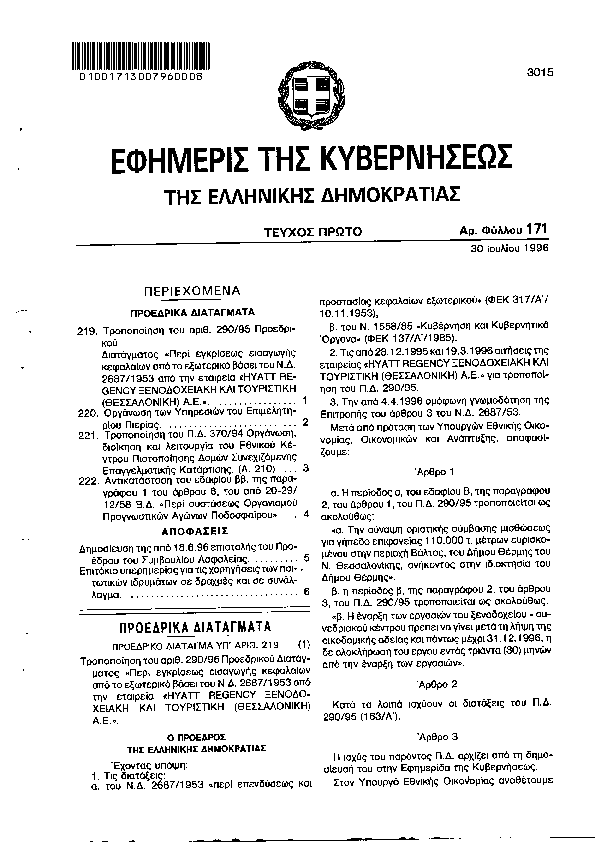 ΠΕΡΙ ΤΡΟΠΟΠΟΙΗΣΕΩΣ ΤΟΥ ΑΡΙΘΜ.290/95 ΠΔ ΠΕΡΙ ΕΓΚΡΙΣΕΩΣ ΕΙΣΑΓΩΓΗΣ ΚΕΦΑΛΑΙΩΝ ΑΠΟ ΤΟ ΕΞΩΤΕΡΙΚΟ ΒΑΣΕΙ ΤΟΥ Ν.Δ.2687/1953 ΑΠΟ ΤΗΝ ΕΤΑΙΡΕΑΙ HYATT REGENCY ΞΕΝΟΔΟΧΕΙΑΚΗ ΚΑΙ ΤΟΥΡΙΣΤΙΚΗ ΑΕ