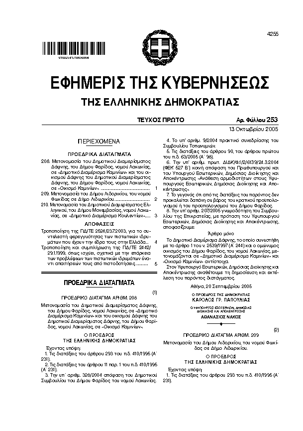 • ΜΕΤΟΝΟΜΑΣΙΑ ΤΟΥ ΔΗΜΟΤΙΚΟΥ ΔΙΑΜΕΡΙΣΜΑΤΟΣ ΔΑΦΝΗΣ, ΤΟΥ ΔΗΜΟΥ ΦΑΡΙΔΟΣ, ΝΟΜΟΥ ΛΑΚΩΝΙΑΣ, ΣΕ ΔΗΜΟΤΙΚΟ ΔΙΑΜΕΡΙΣΜΑ ΚΑΜΙΝΙΩΝ ΚΑΙ ΤΟΥ ΟΙΚΙΣΜΟΥ ΔΑΦΝΗΣ ΤΟΥ ΔΗΜΟΤΙΚΟΥ ΔΙΑΜ. ΔΑΦΝΗΣ ΤΟΥ ΔΗΜΟΥ ΦΑΡΙΔΟΣ ΝΟΜΟΥ ΛΑΚΩΝΙΑΣ ΣΕ ΟΙΚΙΣΜΟ ΚΑΜΙΝΙΩΝ