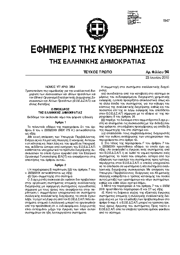 ΤΡΟΠΟΠΟΙΗΣΗ ΤΗΣ ΝΟΜΟΘΕΣΙΑΣ ΓΙΑ ΤΗΝ ΕΝΑΛΛΑΚΤΙΚΗ ΔΙΑΧΕΙΡΙΣΗ ΤΩΝ ΣΥΣΚΕΥΑΣΙΩΝ ΚΑΙ ΑΛΛΩΝ ΠΡΟΙΟΝΤΩΝ ΚΑΙ ΤΟΝ ΕΘΝΙΚΟ ΟΡΓΑΝΙΣΜΟ ΕΝΑΛΛΑΚΤΙΚΗΣ ΔΙΑΧΕΙΡΙΣΗΣ ΣΥΣΚΕΥΑΣΙΩΝ ΚΑΙ ΑΛΛΩΝ ΠΡΟΙΟΝΤΩΝ (Ε.Ο.Ε.Δ.Σ.Α.Π.) ΚΑΙ ΑΛΛΕΣ ΔΙΑΤΑΞΕΙΣ