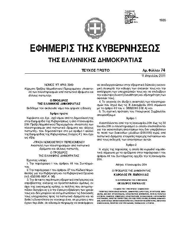 • ΚΥΡΩΣΗ ΠΡΑΞΗΣ ΝΟΜΟΘΕΤΙΚΟΥ ΠΕΡΙΕΧΟΜΕΝΟΥ «ΑΝΑΣΤΟΛΗ ΤΩΝ ΠΛΕΙΣΤΗΡΙΑΣΜΩΝ ΑΠΟ ΠΙΣΤΩΤΙΚΑ ΙΔΡΥΜΑΤΑ ΚΑΙ ΑΛΛΟΥΣ ΠΙΣΤΩΤΕΣ».
