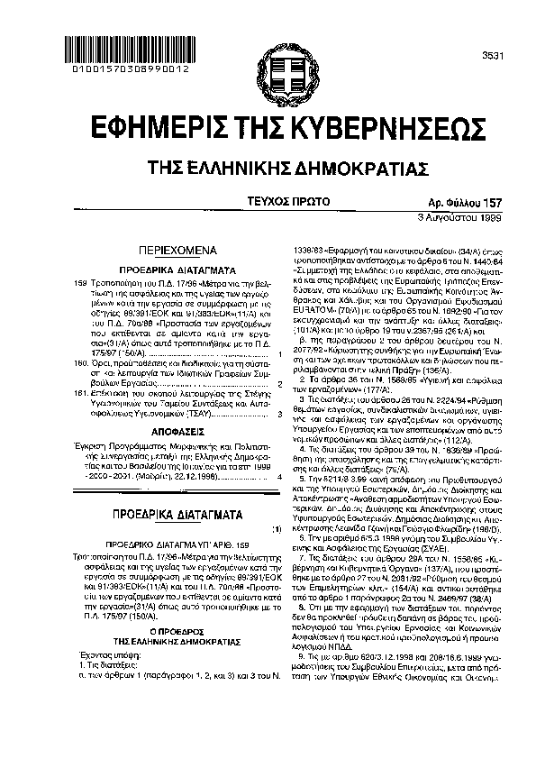 • ΤΡΟΠΟΠΟΙΗΣΗ ΤΟΥ Π.Δ 17/96 ΜΕΤΡΑ ΓΙΑ ΤΗ ΒΕΛΤΙΩΣΗ ΤΗΣ ΑΣΦΑΛΕΙΑΣ ΚΑΙ ΤΗΣ ΥΓΕΙΑΣ ΤΩΝ ΕΡΓΑΖΟΜΕΝΩΝ