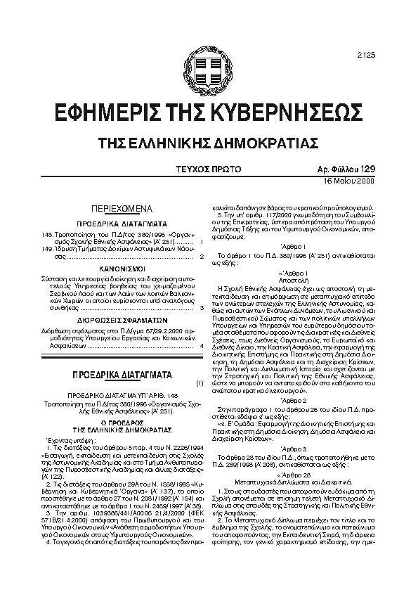 • ΤΡΟΠΟΠΟΙΗΣΗ ΤΟΥ Π.Δ. 380/1996 ΟΡΓΑΝΙΣΜΟΣ ΣΧΟΛΗΣ ΕΘΝΙΚΗΣ ΑΣΦΑΛΕΙΑΣ