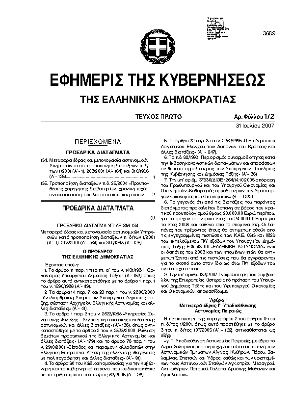 • ΜΕΤΑΦΟΡΑ ΕΔΡΑΣ ΚΑΙ ΜΕΤΟΝΟΜΑΣΙΑ ΑΣΤΥΝΟΜΙΚΩΝ ΥΠΗΡΕΣΙΩΝ, ΚΑΤΑ ΤΡΟΠΟΠΟΙΗΣΗ ΔΙΑΤΑΞΕΩΝ Π. Δ/ΤΩΝ 1/2001 (Α΄- 1), 208/2001 (Α΄- 164) ΚΑΙ 310/1998 (Α΄- 125).