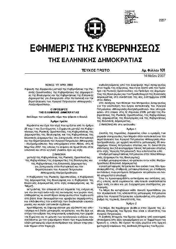 • ΚΥΡΩΣΗ ΤΗΣ ΣΥΜΦΩΝΙΑΣ ΜΕΤΑΞΥ ΤΗΣ ΚΥΒΕΡΝΗΣΕΩΣ ΤΗΣ ΡΩΣΙΚΗΣ ΟΜΟΣΠΟΝΔΙΑΣ, ΤΗΣ ΚΥΒΕΡΝΗΣΕΩΣ ΤΗΣ ΔΗΜΟΚΡΑΤΙΑΣ ΤΗΣ ΒΟΥΛΓΑΡΙΑΣ ΚΑΙ ΤΗΣ ΚΥΒΕΡΝΗΣΕΩΣ ΤΗΣ ΕΛΛΗΝΙΚΗΣ ΔΗΜΟΚΡΑΤΙΑΣ ΓΙΑ ΣΥΝΕΡΓΑΣΙΑ ΣΤΗΝ ΚΑΤΑΣΚΕΥΗ ΚΑΙ ΤΗΝ ΕΚΜΕΤΑΛΛΕΥΣΗ ΤΟΥ ΑΓΩΓΟΥ ΠΕΤΡΕΛΑΙΟΥ «ΜΠΟΥΡΓΚΑΣ - ΑΛΕΞΑΝΔΡΟΥΠΟΛΗ».