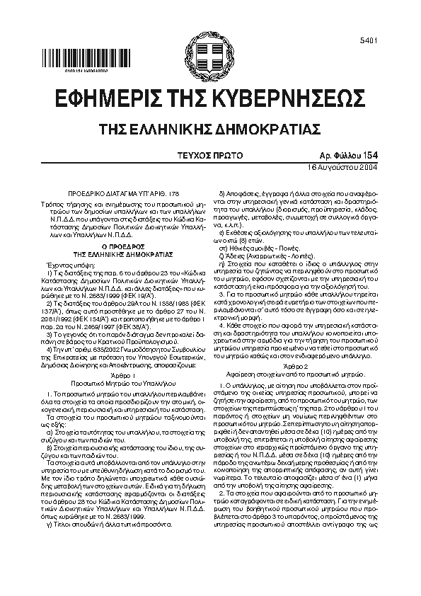 ΤΡΟΠΟΣ ΤΗΡΗΣΗΣ ΚΑΙ ΕΝΗΜΕΡΩΣΗΣ ΤΟΥ ΠΡΟΣΩΠΙΚΟΥ ΜΗΤΡΩΟΥ ΤΩΝ ΔΗΜΟΣΙΩΝ ΥΠΑΛΛΗΛΩΝ ΚΑΙ ΤΩΝ ΥΠΑΛΗΛΩΝ ΝΠΔΔ ΠΟΥ ΥΠΑΓΟΝΤΑΙ ΣΤΙΣ ΔΙΑΤΑΞΕΙΣ ΤΟΥ ΚΩΔΙΚΑ ΚΑΤΑΣΤΑΣΗΣ ΔΗΜΟΣΙΩΝ ΠΟΛΙΤΙΚΩΝ ΔΙΟΙΚΗΤΙΚΩΝ ΥΠΑΛΛΗΛΩΝ ΚΑΙ ΥΠΑΛΛΗΛΩΝ ΝΠΔΔ