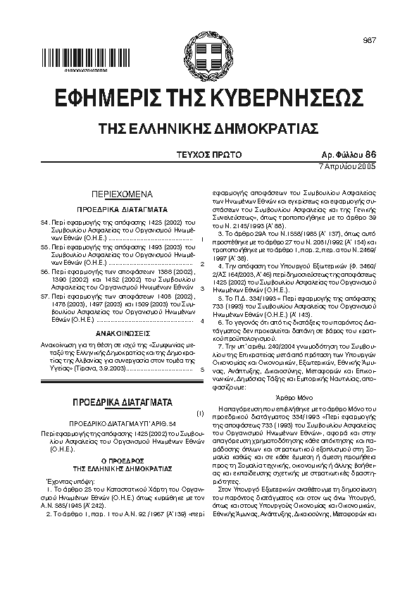• ΠΕΡΙ ΕΦΑΡΜΟΓΗΣ ΤΗΣ ΑΠΟΦΑΣΗΣ 1425(2002) ΤΟΥ ΣΥΜΒΟΥΛΙΟΥ ΑΣΦΑΛΕΙΑΣ ΤΟΥ ΟΡΓΑΝΙΣΜΟΥ ΗΝΩΜΕΝΩΝ ΕΘΝΩΝ (ΟΗΕ)