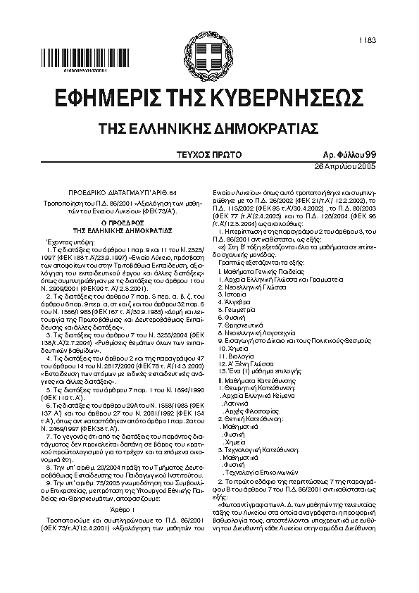 • ΤΡΟΠΟΠΟΙΗΣΗ ΤΟΥ ΠΔ 86/2001 ΑΞΙΟΛΟΓΗΣΗΣ ΤΩΝ ΜΑΘΗΤΩΝ ΤΟΥ ΕΝΙΑΙΟΥ ΛΥΚΕΙΟΥ (ΦΕΚ 73/Α)