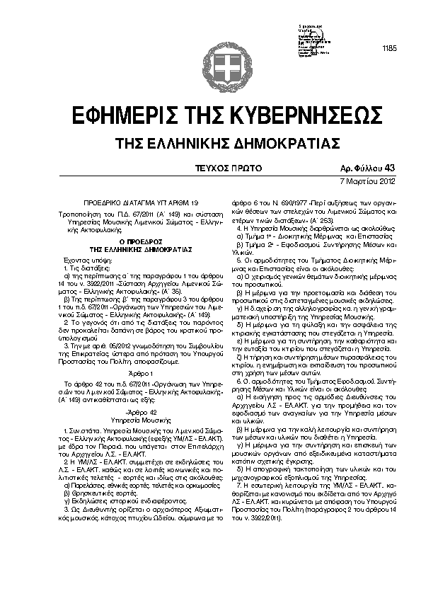 • ΤΡΟΠΟΠΟΙΗΣΗ ΤΟΥ Π.Δ. 67/2011 (Α’ 149) ΚΑΙ ΣΥΣΤΑΣΗ ΥΠΗΡΕΣΙΑΣ ΜΟΥΣΙΚΗΣ ΛΙΜΕΝΙΚΟΥ ΣΩΜΑΤΟΣ – ΕΛΛΗΝΙΚΗΣ ΑΚΤΟΦΥΛΑΚΗΣ.