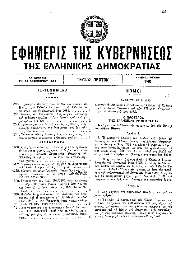 • ΠΡΟΣΩΡΙΝΗ ΔΙΟΙΚΗΣΗ ΤΩΝ ΕΣΟΔΩΝ ΚΑΙ ΕΞΟΔΩΝ ΤΟΥ ΚΡΑΤΟΥΣ ΚΑΙ ΕΙΔΙΚΩΝ ΤΑΜΕΙΩΝ ΚΑΙ ΤΩΝ ΕΙΔΙΚΩΝ ΥΠΗΡΕΣΙΩΝ, ΓΙΑ ΤΟ ΟΙΚΟΝΟΜΙΚΟ ΕΤΟΣ 1982.