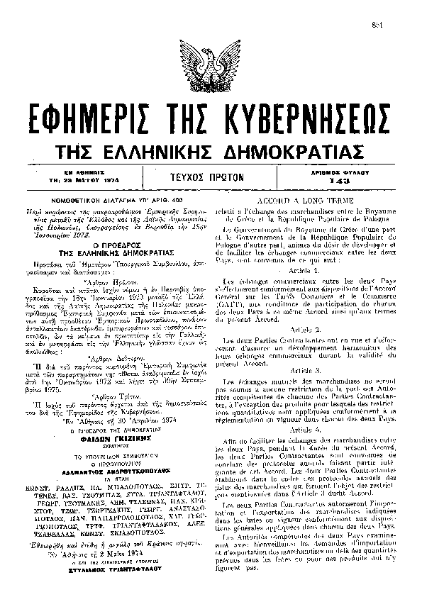 ΠΕΡΙ ΚΥΡΩΣΕΩΣ ΤΗΣ ΜΑΚΡΟΠΡΟΘΕΣΜΟΥ ΕΜΠΟΡΙΚΗΣ ΣΥΜΦΩΝΙΑΣ ΜΕΤΑΞΥ ΤΗΣ ΕΛΛΑΔΟΣ ΚΑΙ ΤΗΣ ΛΑΪΚΗΣ ΔΗΜΟΚΡΑΤΙΑΣ ΤΗΣ ΠΟΛΩΝΙΑΣ, ΥΠΟΓΡΑΦΕΙΣΗΣ ΕΝ ΒΑΡΣΟΒΙΑ ΤΗΝ 18ΗΝ ΙΑΝΟΥΑΡΙΟΥ 1973