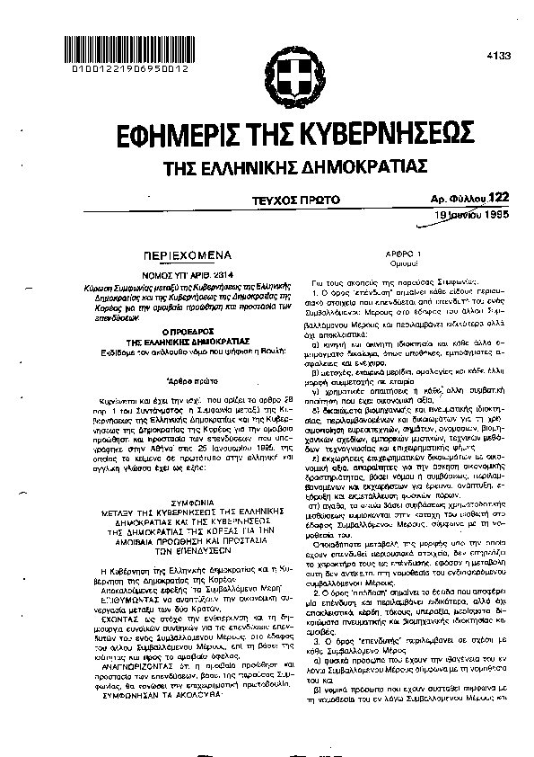 • ΚΥΡΩΣΗ ΣΥΜΦΩΝΙΑΣ ΜΕΤΑΞΥ ΤΗΣ ΚΥΒΕΡΝΗΣΕΩΣ ΤΗΣ ΕΛΛΗΝΙΚΗΣ ΔΗΜΟΚΡΑΤΙΑΣ ΚΑΙ ΤΗΣ ΚΥΒΕΡΝΗΣΕΩΣ ΤΗΣ ΔΗΜΟΚΡΑΤΙΑΣ ΤΗΣ ΚΟΡΕΑΣ ΓΙΑ ΤΗΝ ΑΜΟΙΒΑΙΑ ΠΡΟΩΘΗΣΗ ΚΑΙ ΠΡΟΣΤΑΣΙΑ ΤΩΝ ΕΠΕΝΔΥΣΕΩΝ