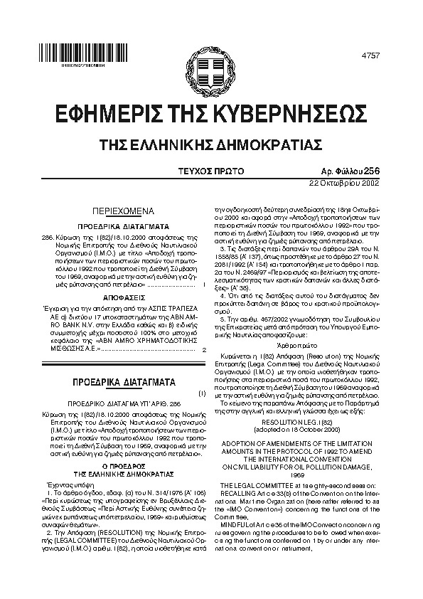 • ΚΥΡΩΣΗ ΤΗΣ ΥΠ` ΑΡΙΘ. 1 (82)/18.10.2000 ΑΠΟΦΑΣΕΩΣ ΤΗΣ ΝΟΜΙΚΗΣ ΕΠΙΤΡΟΠΗΣ ΤΟΥ ΔΙΕΘΝΟΥΣ ΝΑΥΤΙΛΙΑΚΟΥ ΟΡΓΑΝΙΣΜΟΥ (Ι.Μ.Ο.) ΜΕ ΤΙΤΛΟ ΑΠΟΔΟΧΗ ΤΡΟΠΟΠΟΙΗΣΕΩΝ ΤΩΝ ΠΕΡΙΟΡΙΣΤΙΚΩΝ ΠΟΣΩΝ ΤΟΥ ΠΡΩΤΟΚΟΛΛΟΥ 1992 ΠΟΥ ΤΡΟΠΟΠΟΙΕΙ ΤΗ ΔΙΕΘΝΗ ΣΥΜΒΑΣΗ ΤΟΥ 1969, ΑΝΑΦΟΡΙΚΑ ΜΕ Τ