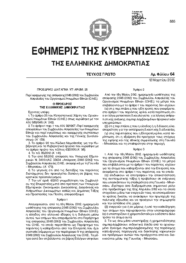 • ΠΕΡΙ ΕΦΑΡΜΟΓΗΣ ΤΗΣ ΑΠΟΦΑΣΗΣ 2048 (2012) ΤΟΥ ΣΥΜΒΟΥΛΙΟΥ ΑΣΦΑΛΕΙΑΣ ΤΟΥ ΟΡΓΑΝΙΣΜΟΥ ΗΝΩΜΕΝΩΝ ΕΘΝΩΝ (Ο.Η.Ε.).