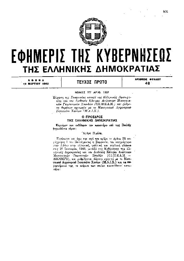 • ΚΥΡΩΣΗ ΤΗΣ ΣΥΜΦΩΝΙΑΣ ΜΕΤΑΞΥ ΤΗΣ ΕΛΛΗΝΙΚΗΣ ΔΗΜΟΚΡΑΤΙΑΣ ΚΑΙ ΤΟΝ ΔΙΕΘΝΟΥΣ ΚΕΝΤΡΟΥ ΑΝΩΤΑΤΩΝ ΜΕΣΟΓΕΙΑΚΩΝ ΓΕΩΠΟΝΙΚΩΝ ΣΠΟΥΔΩΝ (C.I.H.E.A.M.) ΚΑΙ ΡΥΘΜΙΣΗ ΘΕΜΑΤΩΝ ΣΧΕΤΙΚΩΝ ΜΕ ΤΟ ΜΕΣΟΓΕΙΑΚΟ ΑΓΡΟΝΟΜΙΚΟ ΙΝΣΤΙΤΟΥΤΟ ΧΑΝΙΩΝ (Μ.Α.Ι.Χ.).