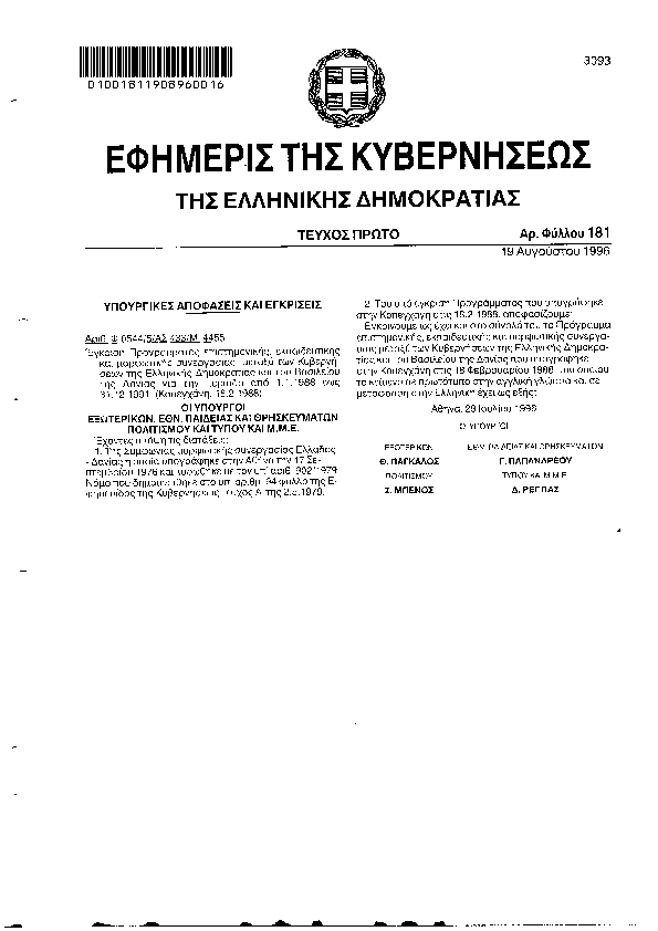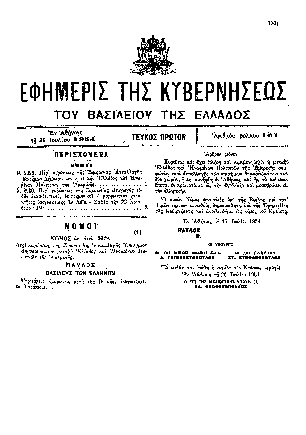 • ΠΕΡΙ ΚΥΡΩΣΕΩΣ ΤΗΣ ΣΥΜΦΩΝΙΑΣ ΑΝΤΑΛΛΑΓΗΣ ΕΠΙΣΗΜΩΝ ΔΗΜΟΣΙΕΥΜΑΤΩΝ ΜΕΤΑΞΥ ΕΛΛΑΔΟΣ ΚΑΙ ΗΝΩΜΕΝΩΝ ΠΟΛΙΤΕΙΩΝ ΤΗΣ ΑΜΕΡΙΚΗΣ