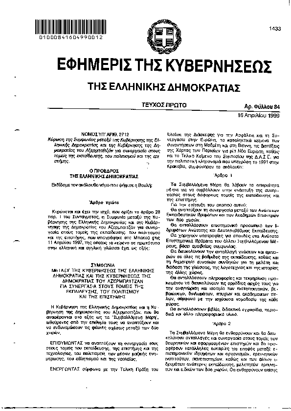 • ΚΥΡΩΣΗ ΤΗΣ ΣΥΜΦΩΝΙΑΣ ΜΕ ΤΑΞΥ ΤΗΣ ΚΥΒΕΡΝΗΣΗΣ ΤΗΣ ΕΛΛΗΝΙΚΗΣ ΔΗΜΟΚΡΑΤΙΑΣ ΚΑΙ ΤΗΣ ΚΥΒΕΡΝΗΣΗΣ ΤΗΣ Δ ΗΜΟΚΡΑΤΙΑΣ ΤΟΥ ΑΖΕΡΜΠΑΙΤΖΑΝ ΓΙΑ ΣΥΝΕΡΓΑΣΙΑ ΣΤΟΥΣ ΤΟΜΕΙΣ ΤΗΣ ΕΚΠΑΙΔΕΥΣΗΣ ΤΟΥ ΠΟΛΙΤΙΣΜΟΥ ΚΑΙ ΤΗΣ ΕΠΙΣΤΗΜΗΣ
