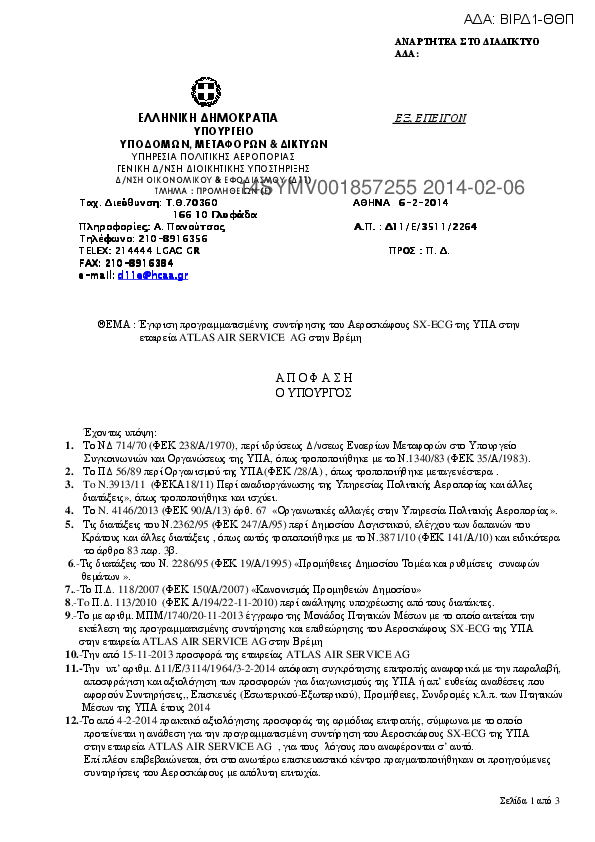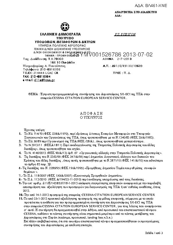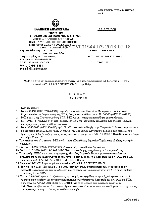 5. Έγκριση προγραμματισμένης συντήρησης του Αεροσκάφους SX-ECG της ΥΠΑ