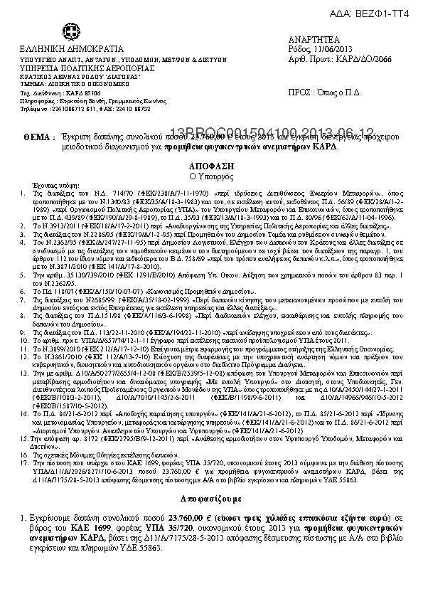 1. Έγκριση δαπάνης συνολικού ποσού 23.760,00 € έτους 2013 και έγκριση διενέργειας πρόχειρου μειοδοτικού διαγωνισμού για προμήθεια φυγοκεντρικών ανεμιστήρων ΚΑΡΔ.