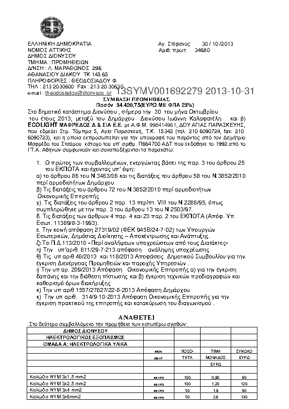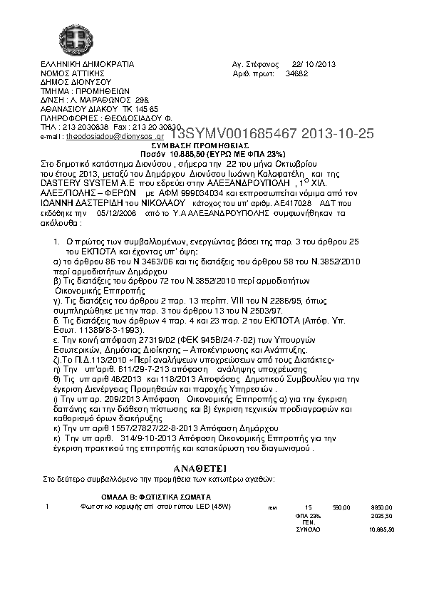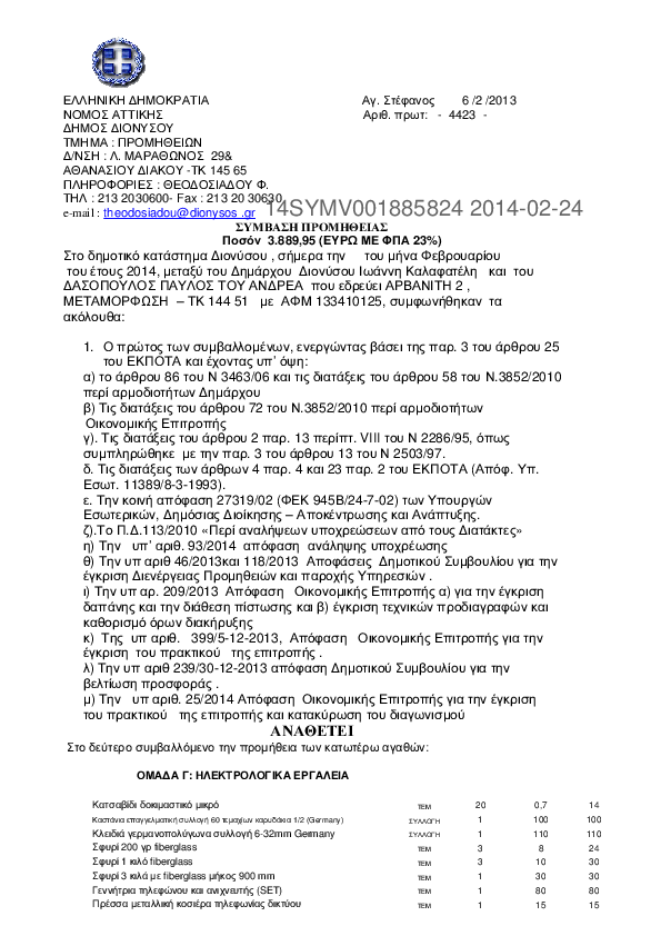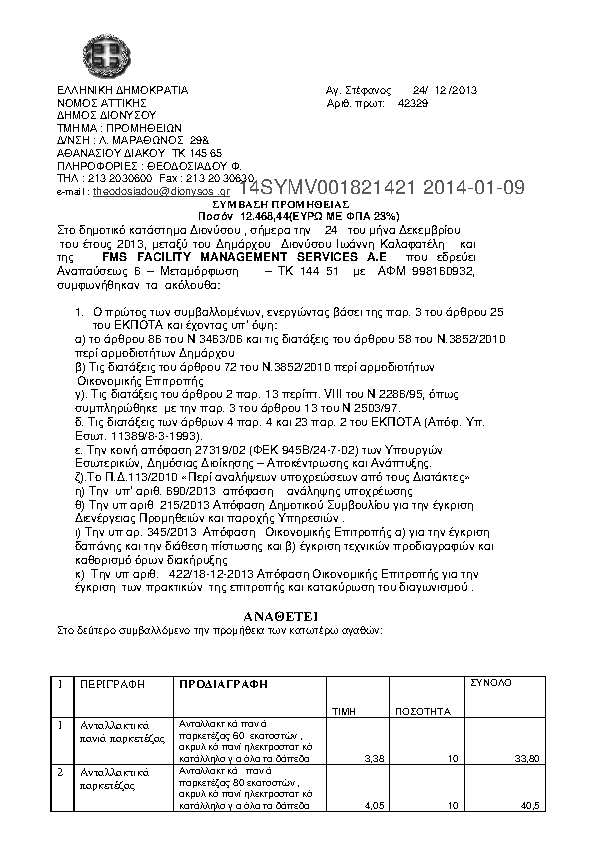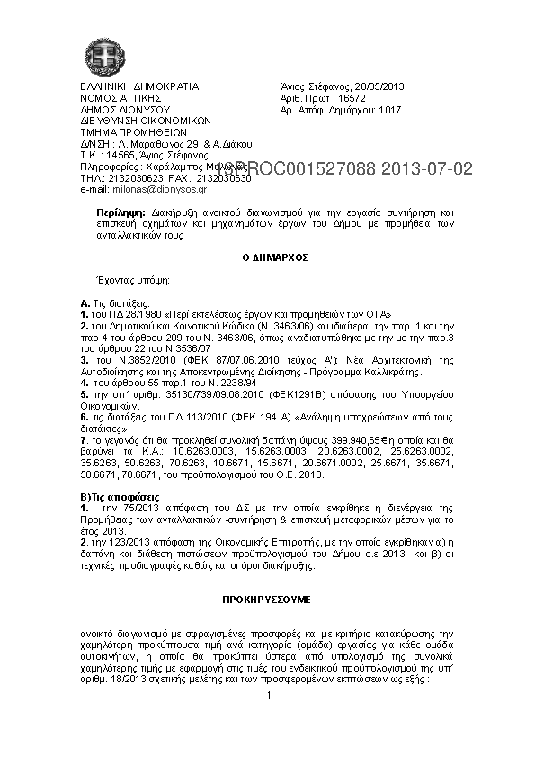 5. Έγκριση μελέτης, όρων διακήρυξης, δαπάνης και διάθεση πίστωσης προϋπολογισμού Δήμου ο.ε. 2013 για την ανάθεση «Προμήθεια Ανταλλακτικών – Συντήρηση & Επισκευή Μεταφορικών Μέσων» του Δήμου Διονύσου