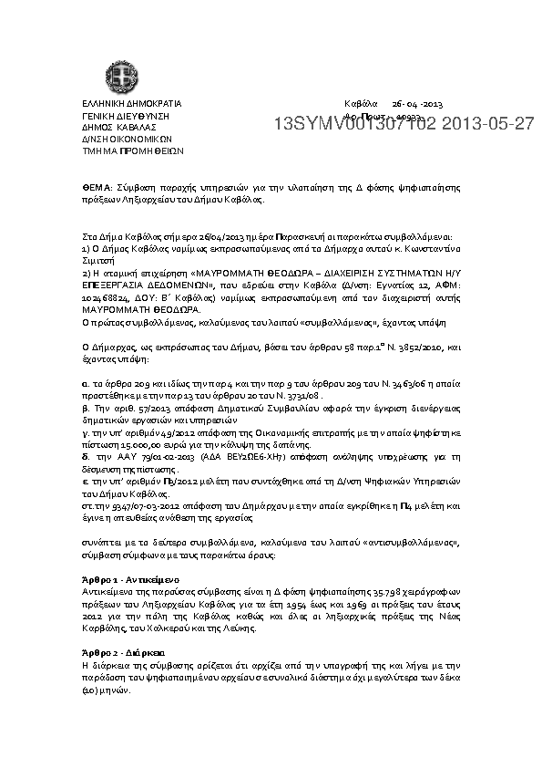 8. Σύμβαση παροχής υπηρεσιών για την υλοποίηση της Δ φάσης ψηφιοποίησης πράξεων Ληξιαρχείου του Δήμου
