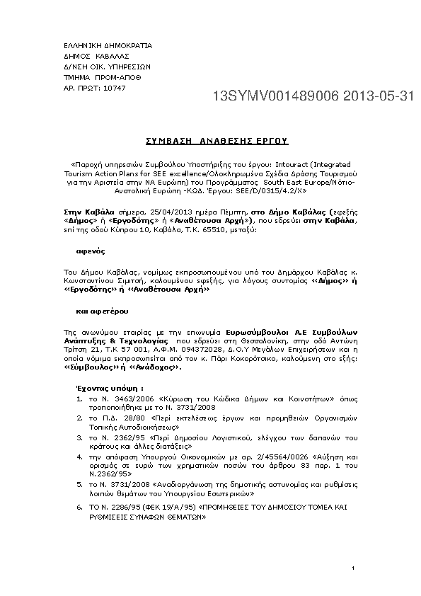 2. Παροχή υπηρεσιών Συμβούλου Υποστήριξης του έργου: Intouract (Integrated Tourism Action Plans for SE)