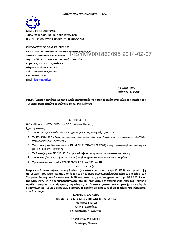 7. Έγκριση δαπάνης για την καθαριότητα του κτηρίου του Τμήματος Βιοιατρικών Ερευνών του ΙΜΒΒ στα Ιωάνν