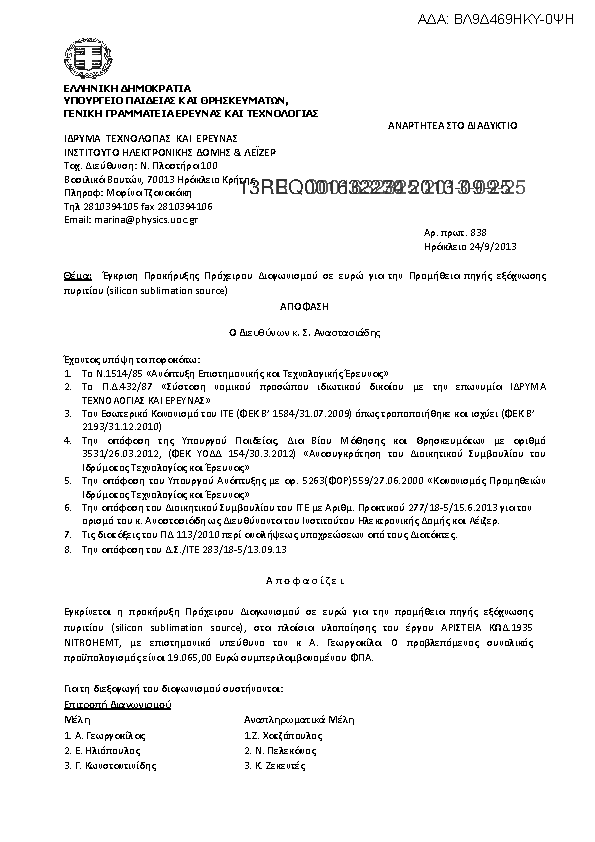 4. Έγκριση Προκήρυξης Πρόχειρου Διαγωνισμού σε ευρώ για την Προμήθεια πηγής εξάχνωσης πυριτίου (silicon
