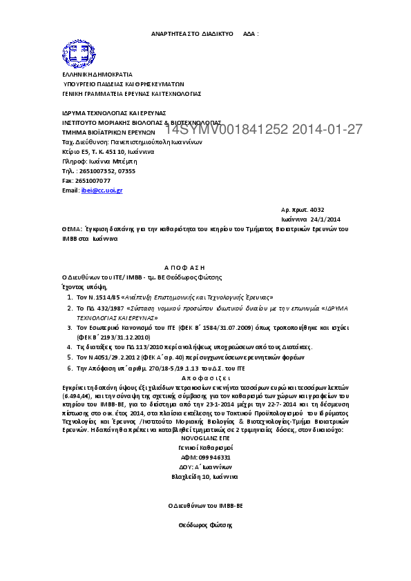 10. Έγκριση δαπάνης για την καθαριότητα του κτιρίου του Τμήματος Βιοϊατρικών Ερευνών του Ι.Μ.Β.Β στα Ιωά