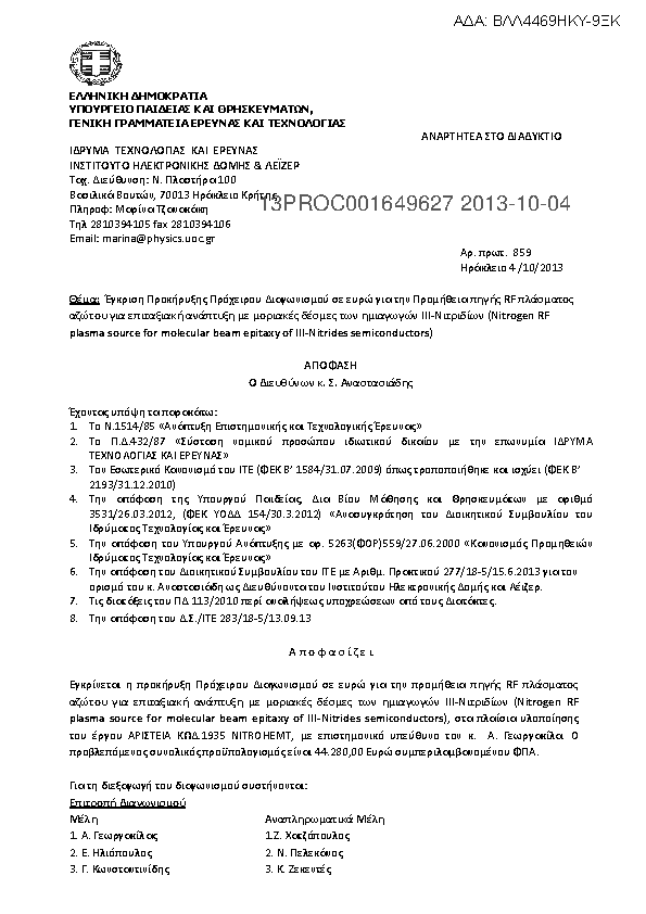 3. Έγκριση Προκήρυξης Πρόχειρου Διαγωνισμού σε ευρώ για την Προμήθεια πηγής RF πλάσματος αζώτου για επιταξιακή ανάπτυξη με μοριακές δέσμες των ημιαγωγών ΙΙΙ