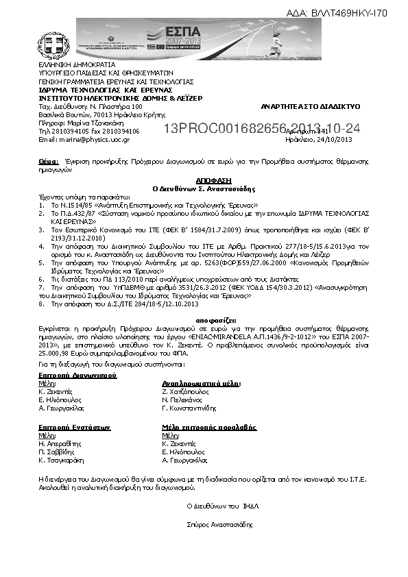 1. Έγκριση προκήρυξης Πρόχειρου διαγωνισμού σε ευρώ για την Προμήθεια συστήματος θέρμανσης ημιαγωγών