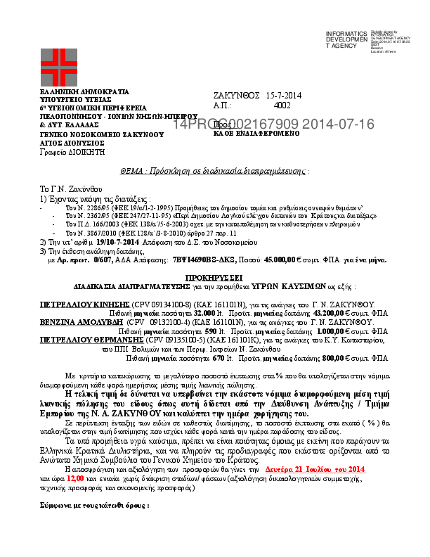 5. Διακήρυξη διαδικασίας διαπραγμάτευσης για προμήθεια ΥΓΡΩΝ ΚΑΥΣΙΜΩΝ, δαπάνης 45.000,00 € / μήνα