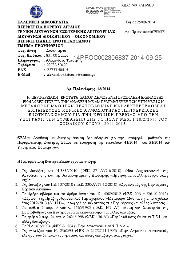 8. Αρ. Πρόσκλησης 19/2014 ΓΙΑ ΤΗΝ ΑΝΑΘΕΣΗ ΜΕ ΔΙΑΠΡΑΓΜΑΤΕΥΣΗ ΤΩΝ ΥΠΗΡΕΣΙΩΝ ΜΕΤΑΦΟΡΑΣ ΜΑΘΗΤΩΝ ΙΚΑΡΙΑΣ