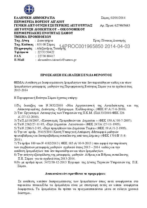 3. ΔΙΑΚΗΡΥΞΗ 8/2014 ΑΝΑΘΕΣΗ ΥΠΗΡΕΣΙΩΝ ΜΕΤΑΦΟΡΑΣ ΜΑΘΗΤΩΝ Π.Ε ΣΑΜΟΥ