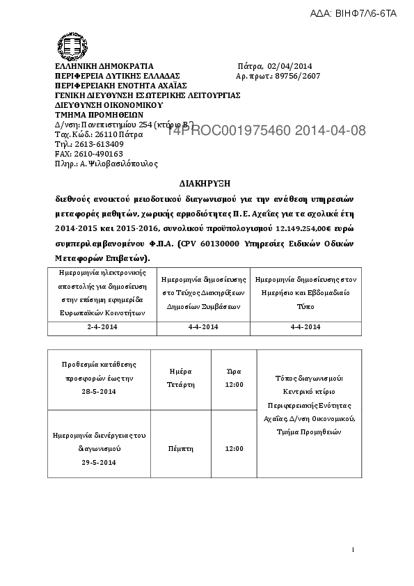 6. Διακήρυξη διεθνούς ανοικτού μειοδοτικού διαγωνισμού για την ανάθεση υπηρεσιών μεταφοράς μαθητών, χωρικής αρμοδιότητας Π. Ε. Αχαΐας για τα σχολικά έτη 2014-2015 και 2015-2016