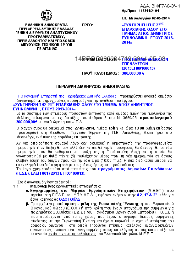 1. ΠΕΡΙΛΗΨΗ ΔΙΑΚΗΡΥΞΗΣ ΔΗΜΟΠΡΑΣΙΑΣ του έργου: «ΣΥΝΤΗΡΗΣΗ ΤΗΣ 23ΗΣ ΕΠΑΡΧΙΑΚΗΣ ΟΔΟΥ ΣΤΟ ΤΜΗΜΑ: ΑΓΙΟΣ ΔΗΜΗΤΡΙΟΣ-ΕΥΗΝΟΛΙΜΝΗ , ΕΤΟΥΣ 2013-2014» προϋπολογισμού 300.000,00€ με αναθεώρηση και Φ.Π.Α.