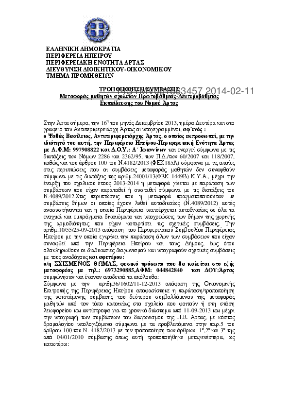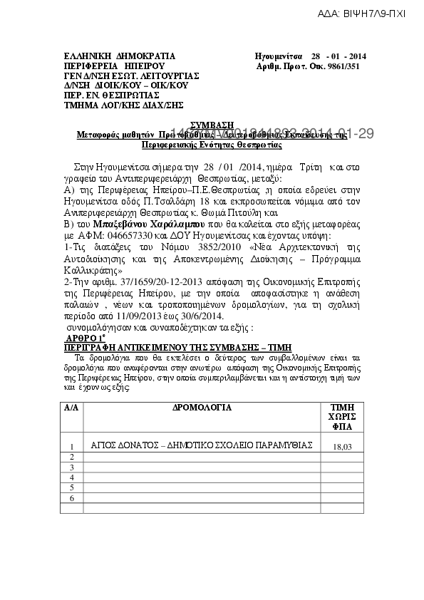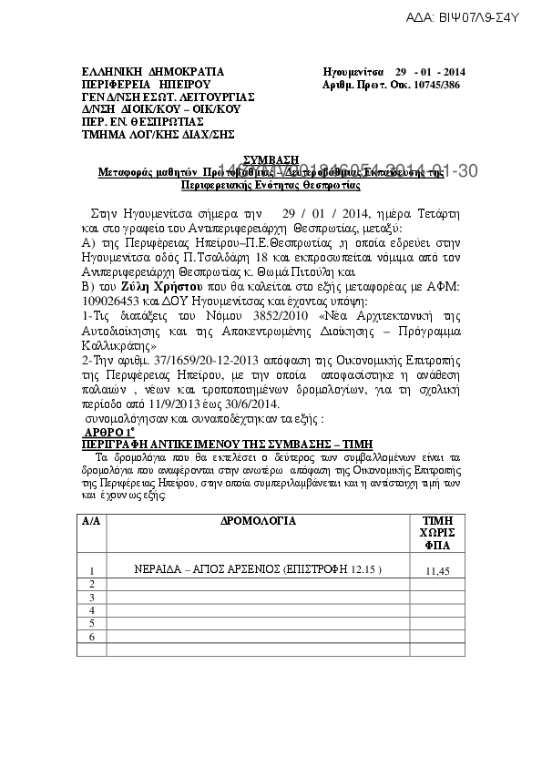 1. Σύμβαση μεταφοράς μαθητών Α/θμιας και Β/θμιας Εκπαίδευσης του Ν.Θεσπρωτίας (ισχύει από 11/09/2013)