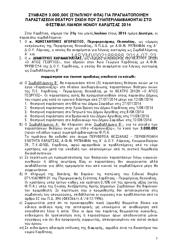 3. ΣΥΜΒΑΣΗ ΓΙΑ ΠΡΑΓΜΑΤΟΠΟΙΗΣΗ ΠΑΡΑΣΤΑΣΕΩΝ ΘΕΑΤΡΟΥ ΣΚΙΩΝ "ΚΑΡΑΓΚΙΟΖΗΣ" ΣΤΟ ΦΕΣΤΙΒΑΛ ΛΙΜΝΩΝ 2014